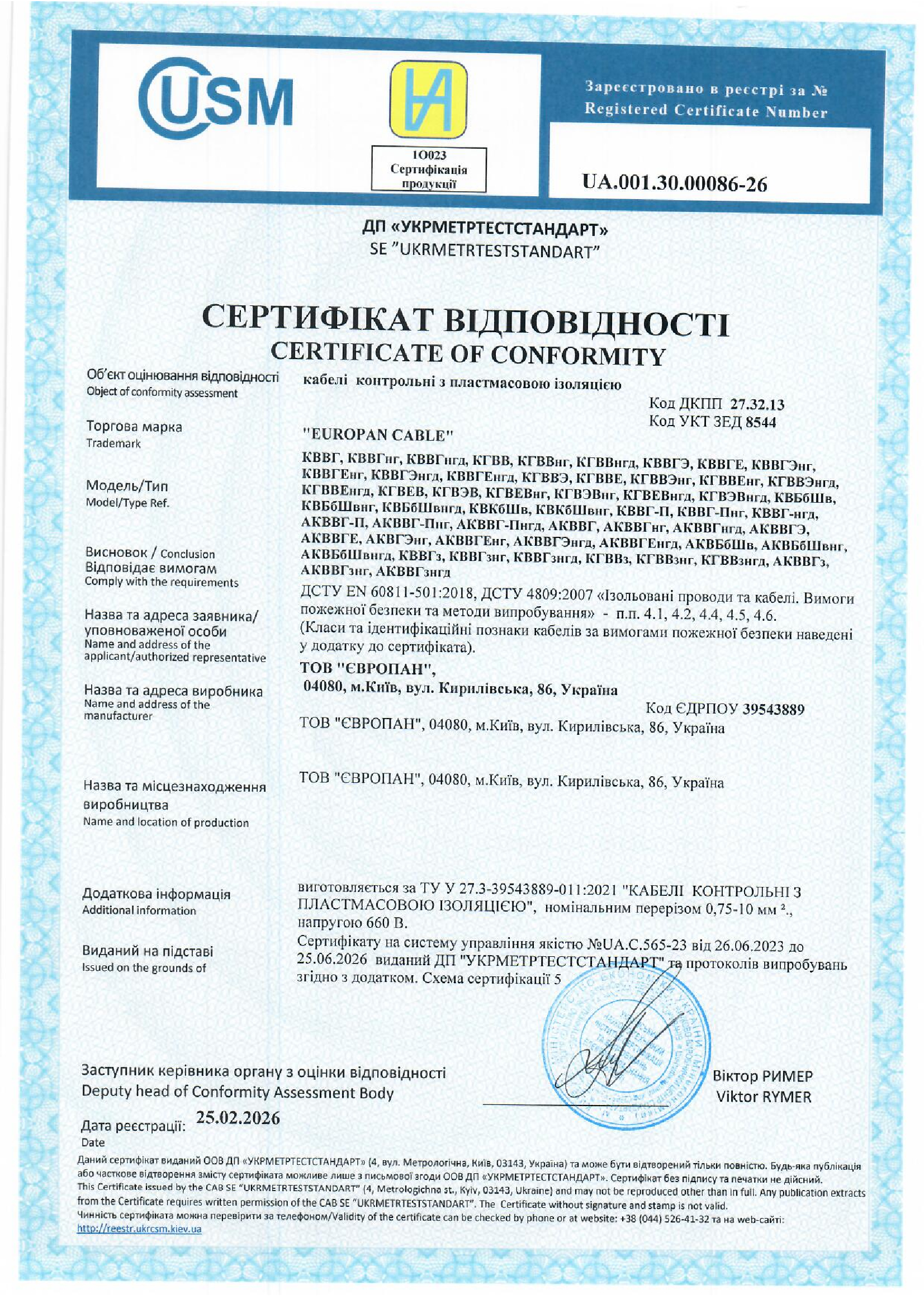 Уся кабельно-провідникова продукція заводу «ЄВРОПАН» під “TM EUROPAN CABLE” пройшла добровільну сертифікацію у держорганах сертифікації, про що видані сертифікати відповідності державного зразка, які підтверджують відповідність продукції, що виготовляється, вимогам законодавства та технічної документації (ГОСТ, ДСТУ). Жорсткий контроль якості виготовленої продукції зумовив необхідність впровадження на підприємстві інтегрованої системи менеджменту на основі міжнародних стандартів ISO. Функція контролю якості кабельно-провідникової продукції, що випускається, покладена на власну акредитовану лабораторію, яка здійснює випробування 100% продукції на відповідність заявленим характеристикам, про що видається протокол приймально-здавальних випробувань.
